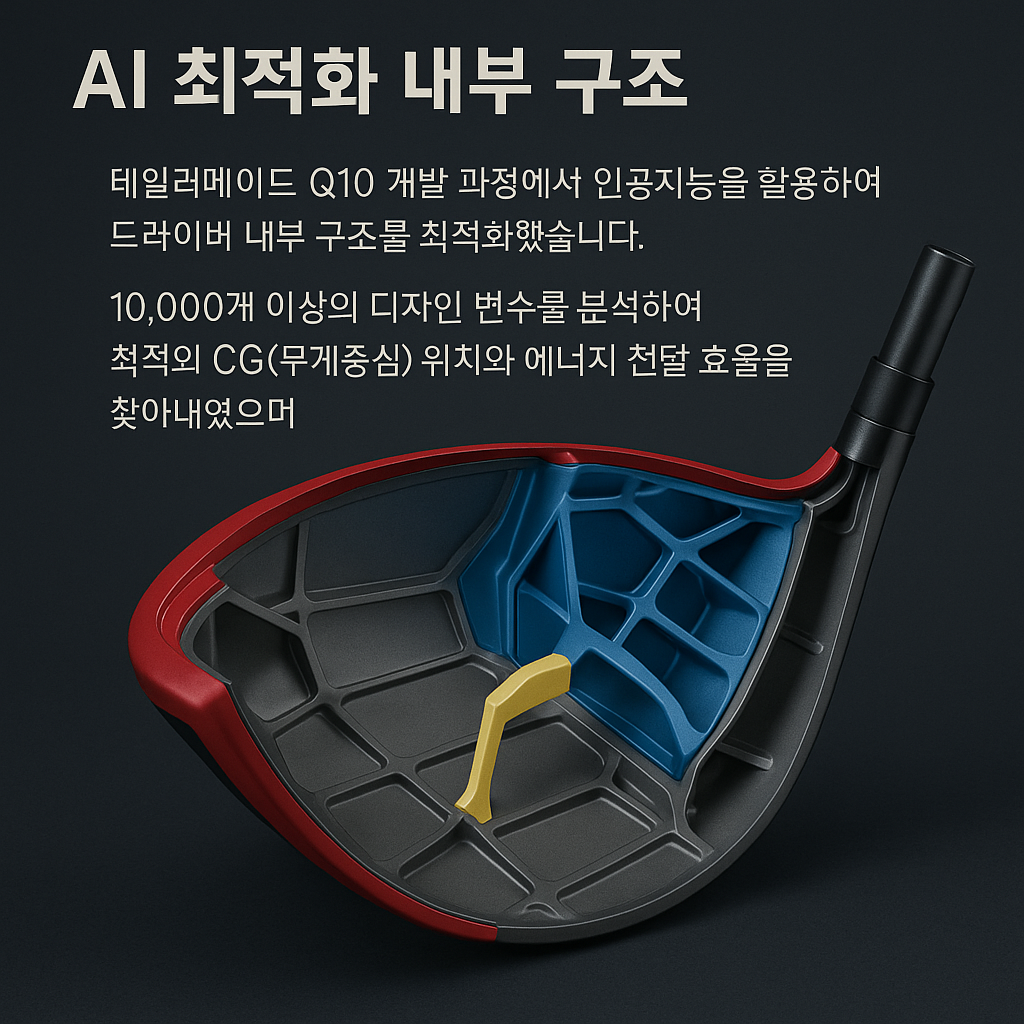 테일러메이드는 Qi10 개발 과정에서 인공지능을 활용하여 드라이버 내부 구조를 최적화했습니다. 10,000개 이상의 디자인 변수를 분석하여 최적의 CG(무게중심) 위치와 에너지 전달 효율을 찾아내었으며, 이를 통해 관성 모멘트(MOI)를 극대화했습니다.